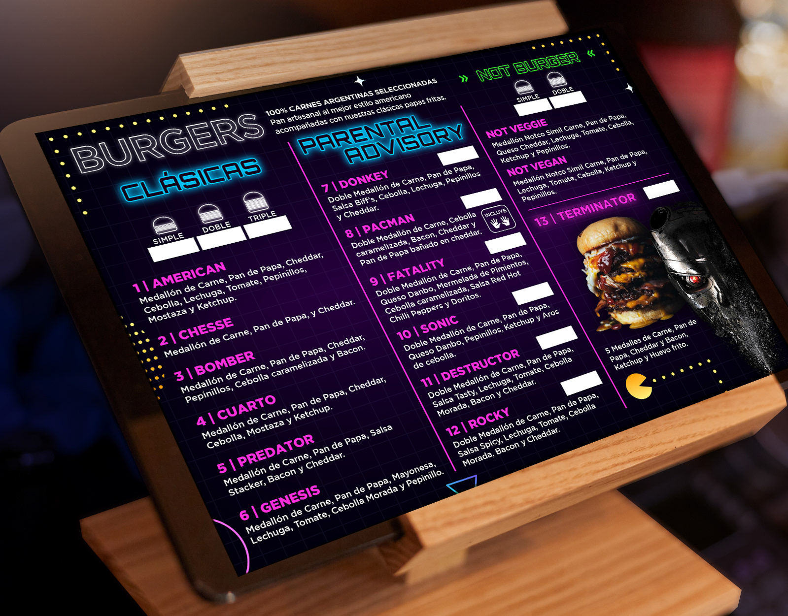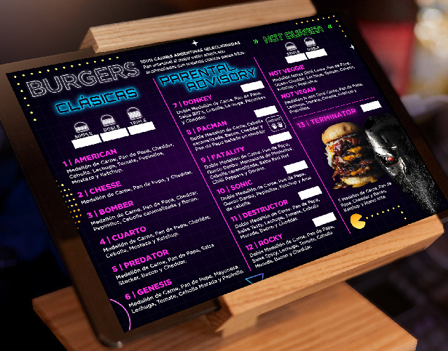 Diseño de Menú, gráfica para pantallas, flyer y redes.